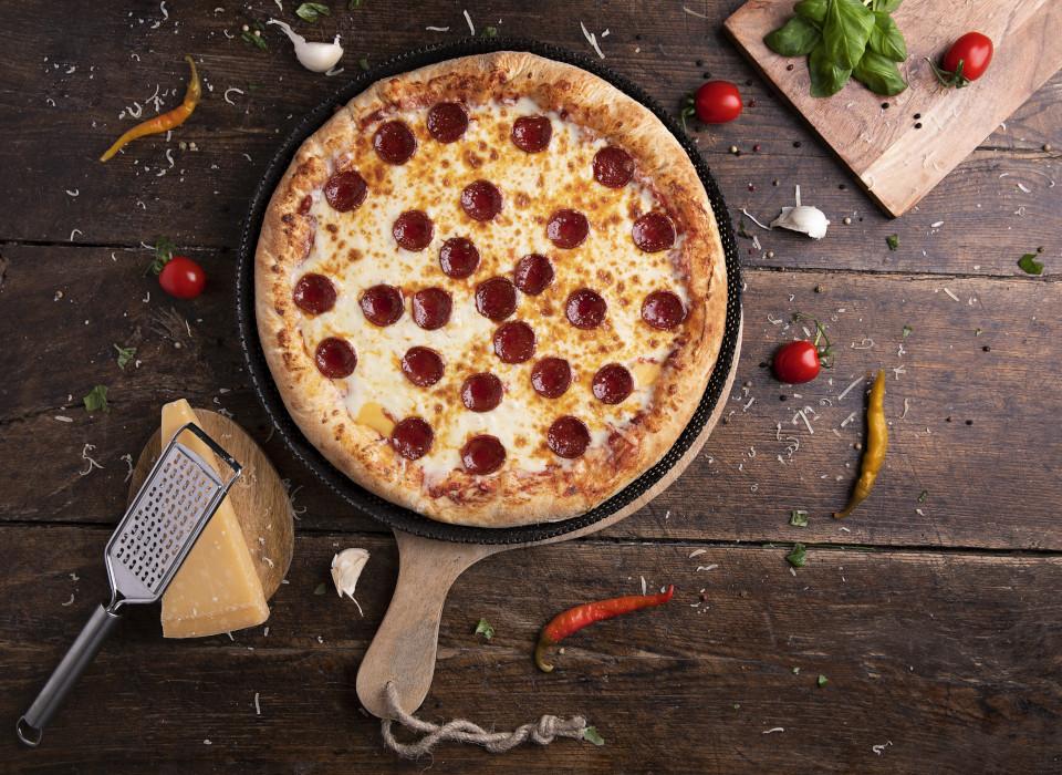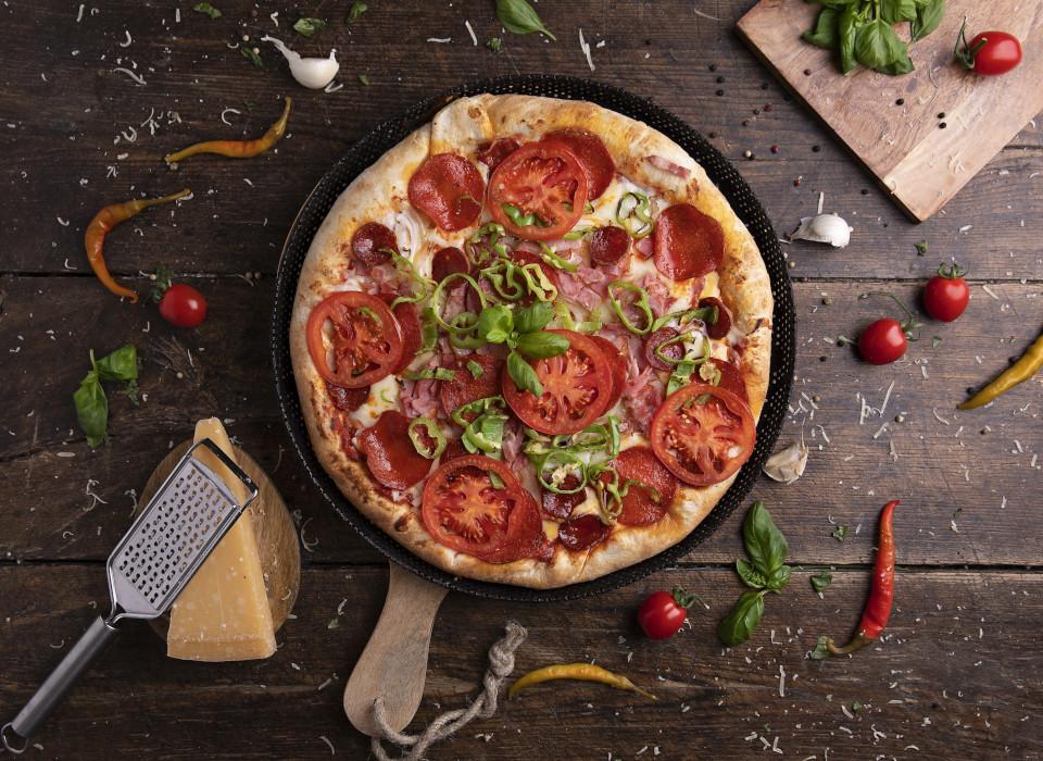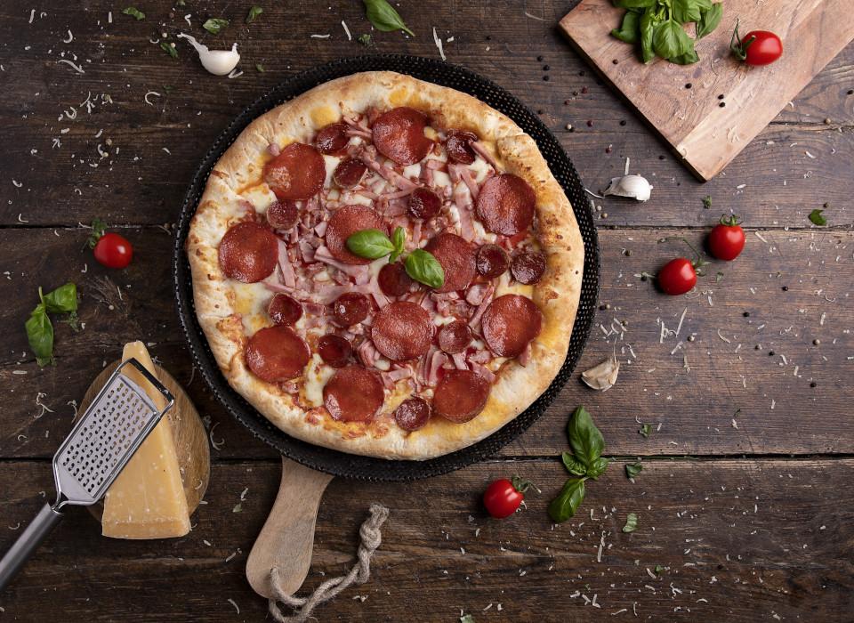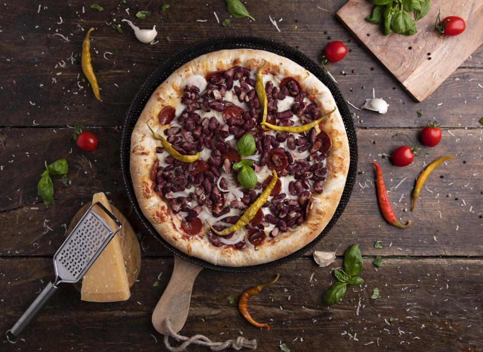 Töltött szél, paradicsomos alap, kolbász, vöröshagyma, bab, pepperoni, mozzarella sajt