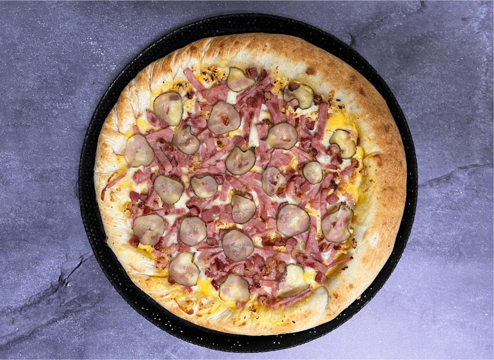 Töltött szél, sajtszósz alap, mozzarella sajt, füstölt sajt, sonka, bacon kocka, csemege uborka