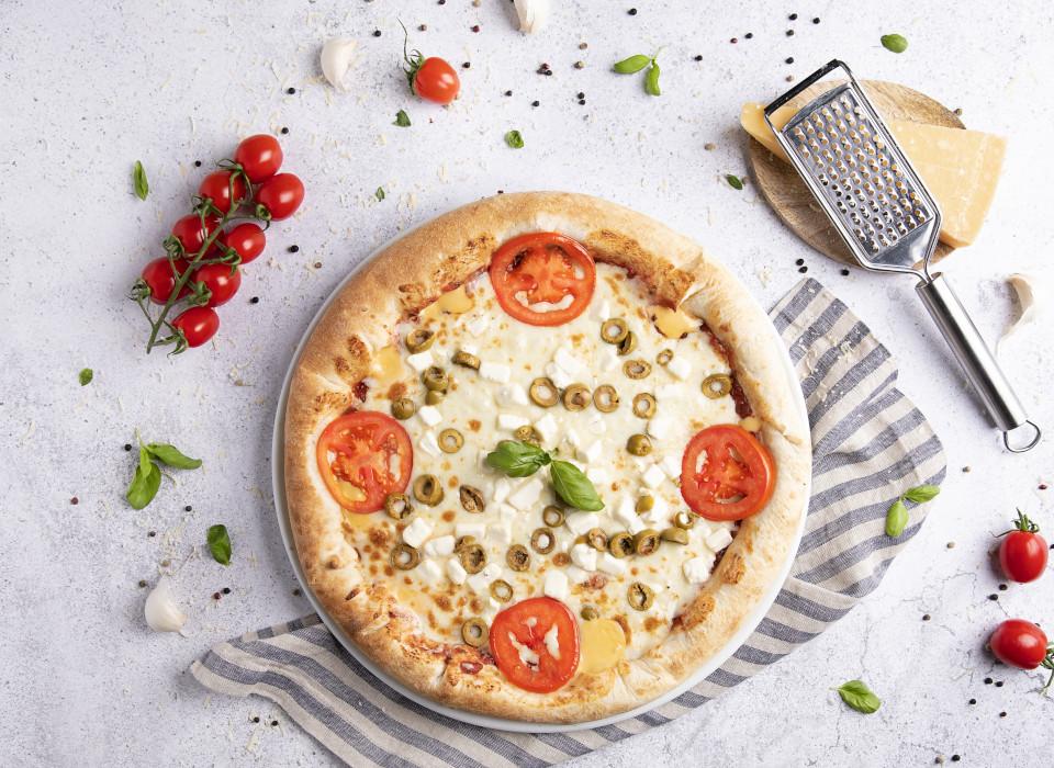 Töltött szél, paradicsomos alap, paradicsom, olíva, feta sajt, mozzarella sajt