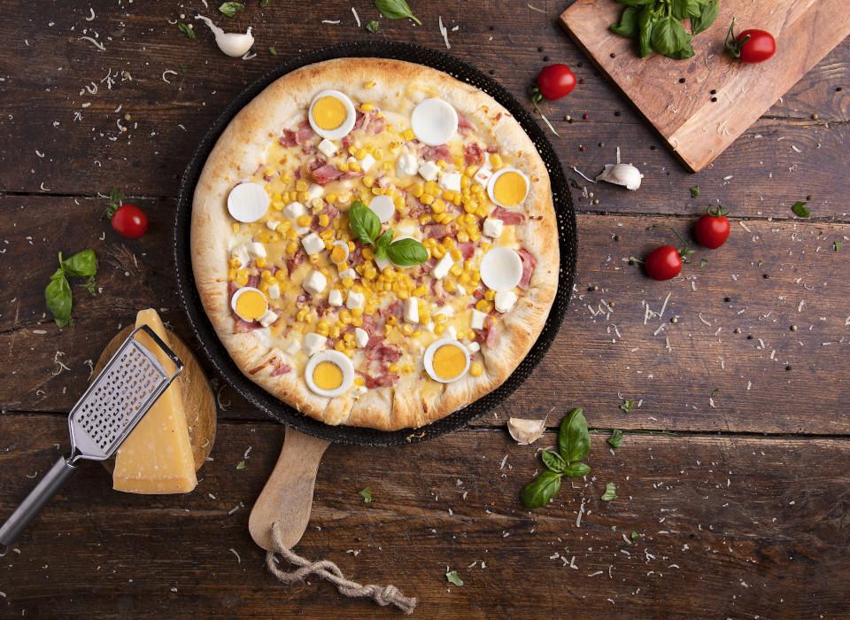 Töltött szél, tejfölös alap, tarja, főtt tojás, feta, kukorica, füstölt sajt, mozzarella sajt