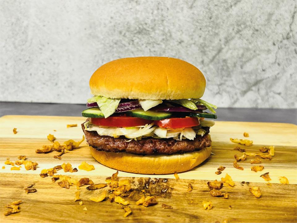 buci zsömle, saját készítésű marhahúspogácsa, sajt, csalamádé, lilahagyma, paradicsom, jégsaláta, uborka, ketchup, mustár, majonéz, pirított hagyma