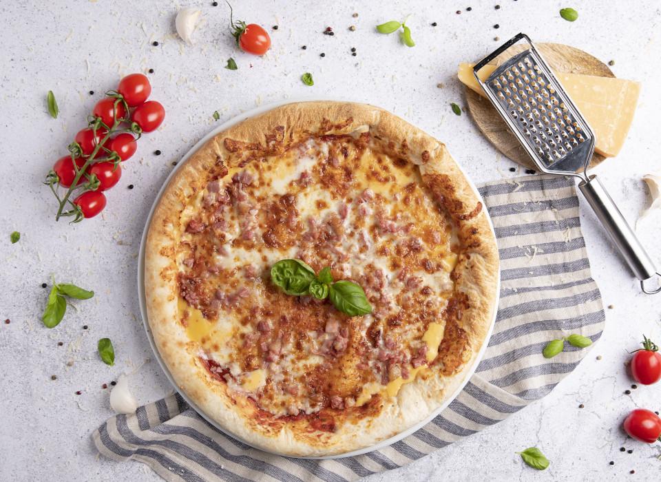 Töltött szél, paradicsomos alap, bacon kocka, mozzarella sajt