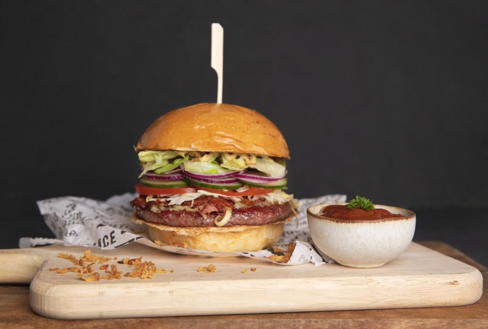 buci zsömle, saját készítésű dupla marhahúspogácsa, sajt, csalamádé, lilahagyma, paradicsom, jégsaláta, uborka, ketchup, mustár, majonéz, pirított hagyma