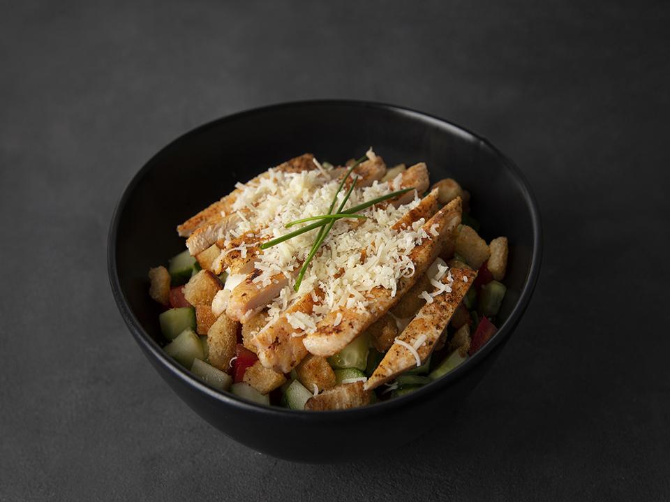 Paradicsom, jégsaláta, kígyóuborka,cézár öntet, grillezett csirkemell, pirított zsemlekocka,parmezán sajt