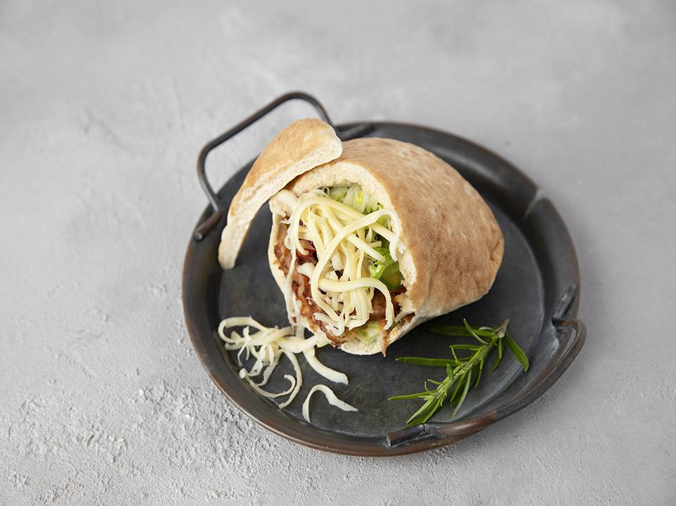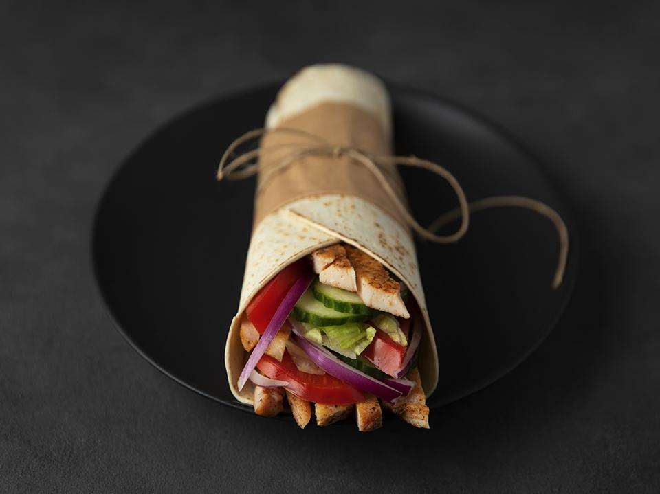 pita, gyroshús, sajt, lilahagyma, jégsaláta, uborka, paradicsom, tzatziki öntet, csípős öntet