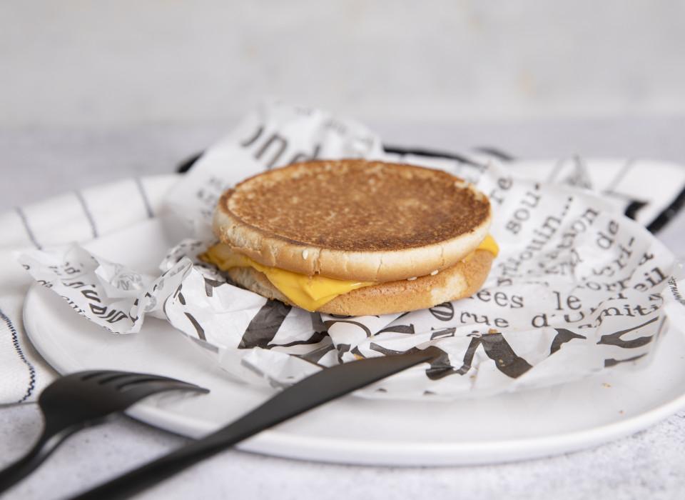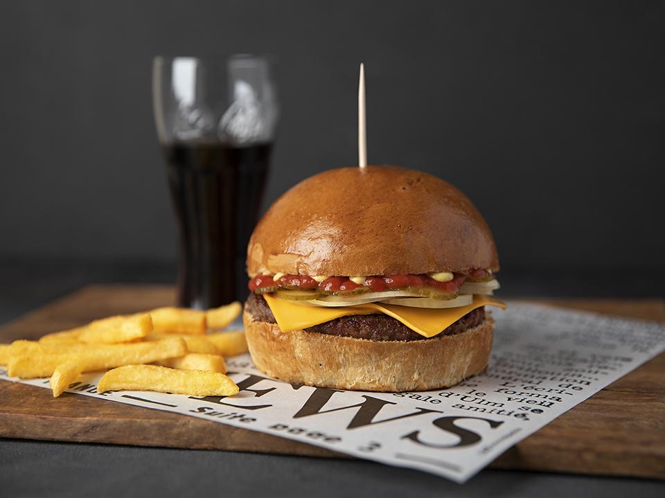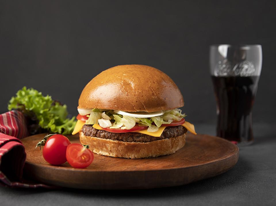 Sajtos amerikai hamburger, kis adag hasábburgonya, 0,2l szívószálas üdítő, desszert