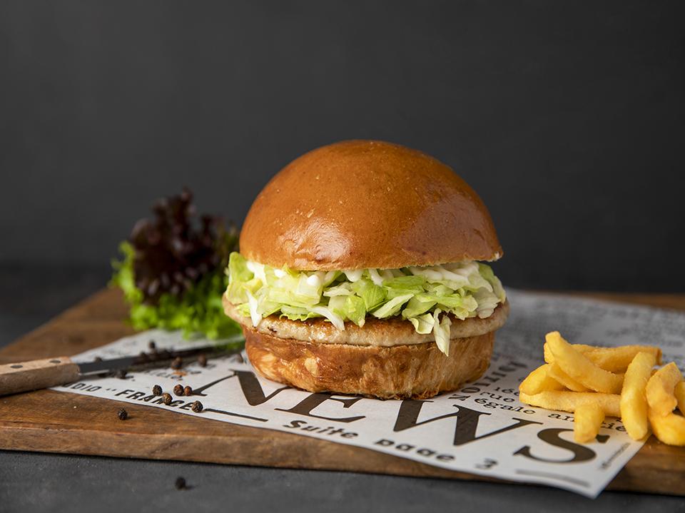 buci zsömle, saját készítésű csirkehúspogácsa, jégsaláta, majonéz