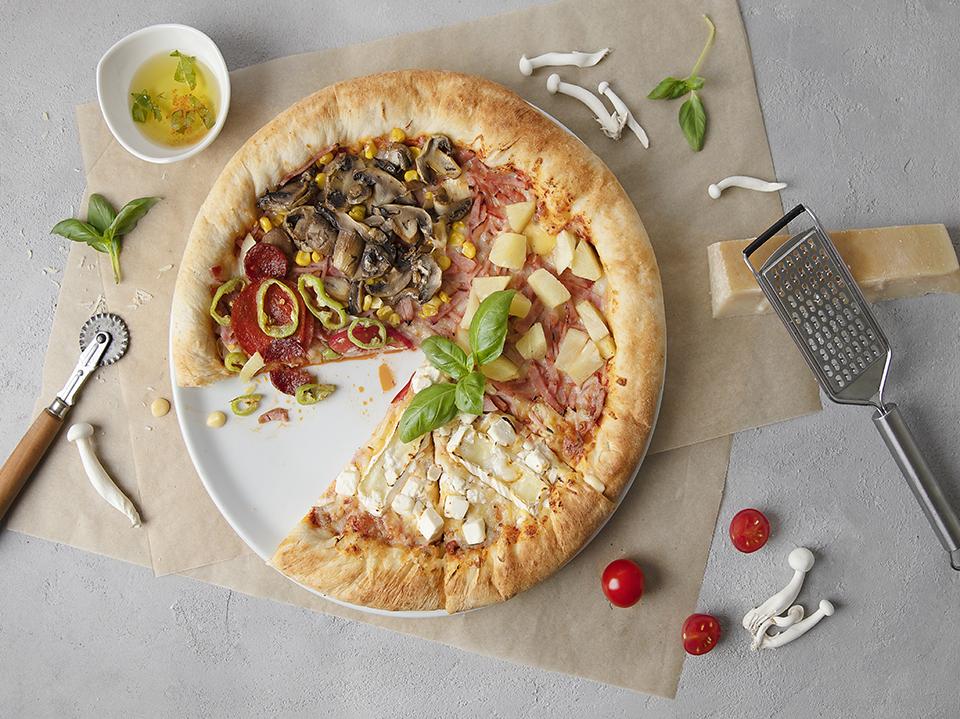 1. negyed: Hawaii pizza 2. negyed: SonGoKu pizza 3. negyed: Sajtözön pizza 4. negyed: Hun pizza