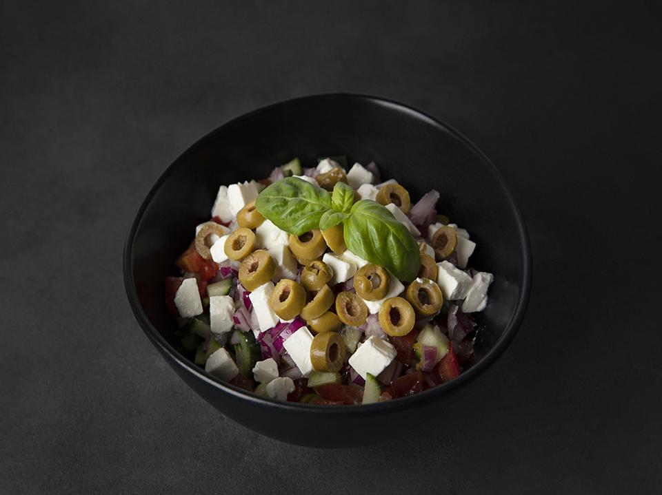 Paradicsom, lilahagyma, kígyóuborka, olíva, feta, dresszing