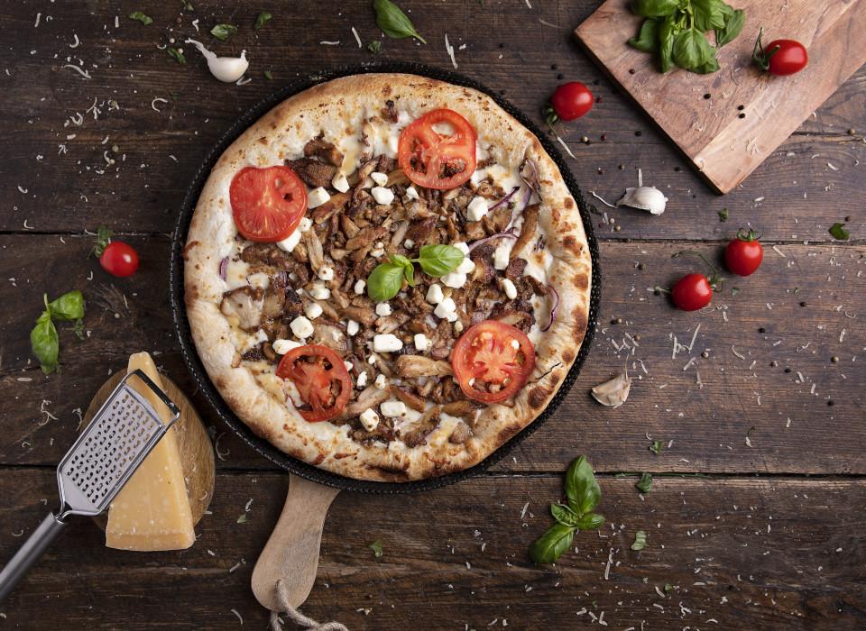Töltött szél, tejfölös alap, gyros hús, lilahagyma, paradicsom, feta sajt, mozzarella sajt