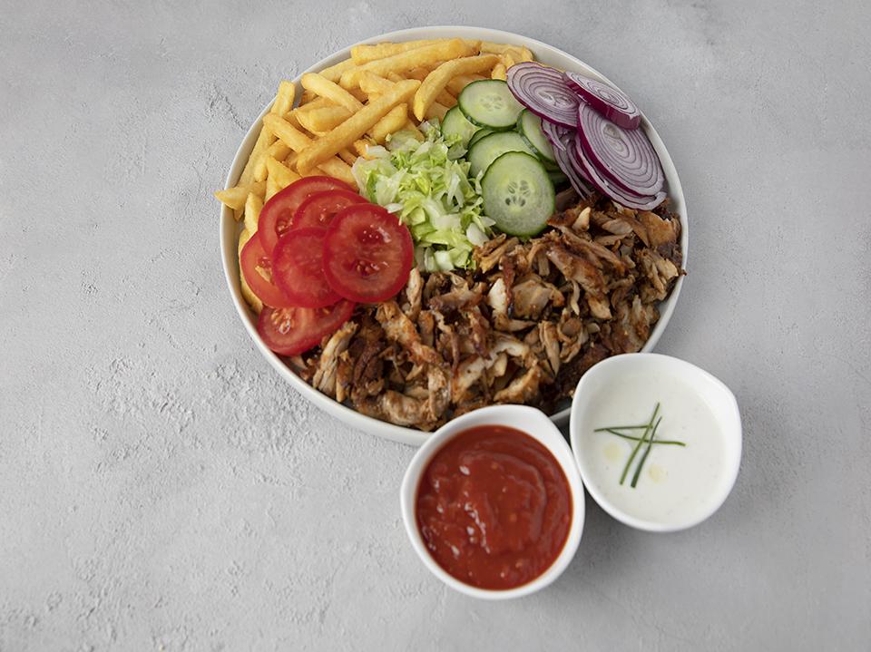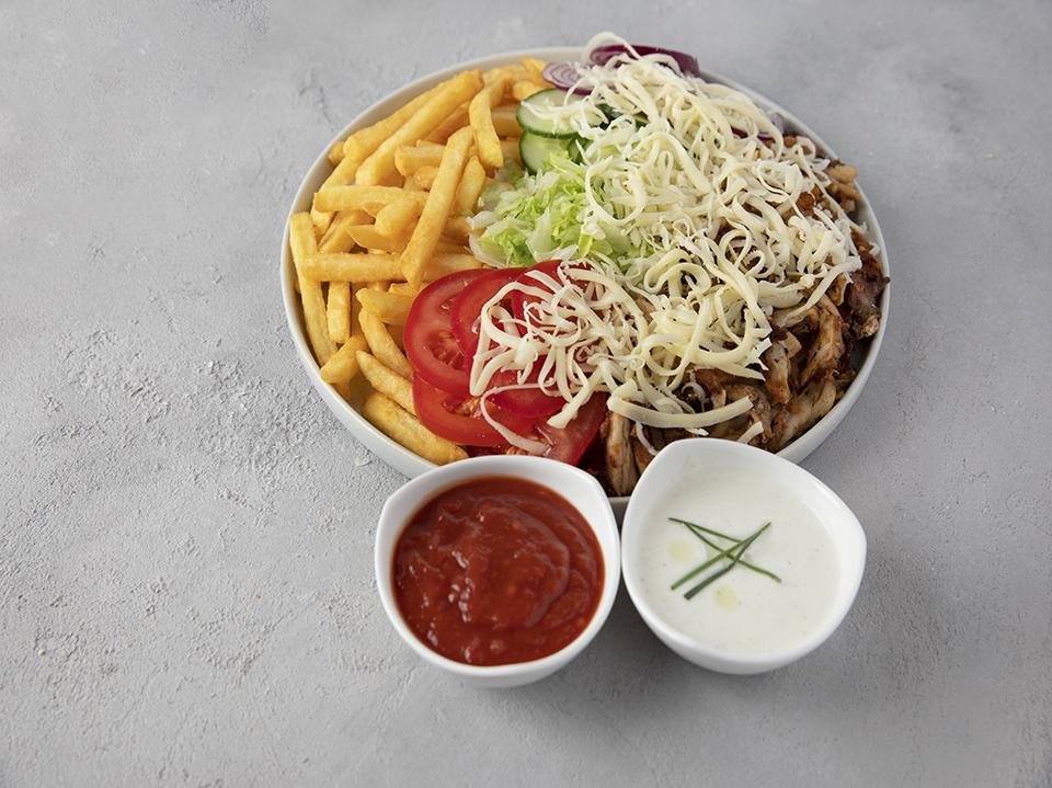 gyros hús, választható köret (hasáb/rizs), reszelt trappista sajt, lilahagyma, jégsaláta, uborka, paradicsom, tzatziki öntet, csípős öntet