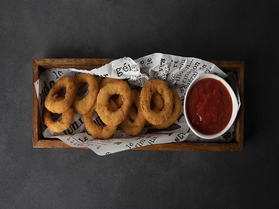 buci, rántott sajt, lilahagyma, paradicsom, jégsaláta, uborka, ketchup, mustár, majonéz, pirított hagyma