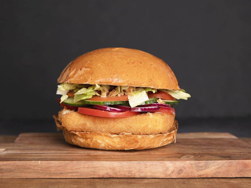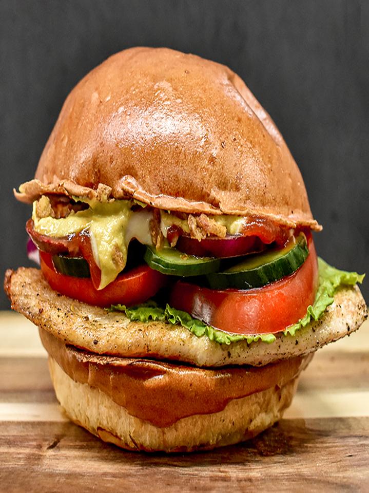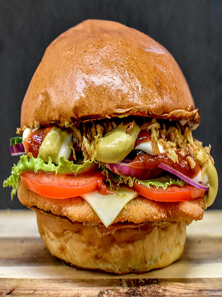 buci zsömle, saját készítésű csirkehúspogácsa, sajt, csalamádé, lilahagyma, paradicsom, jégsaláta, uborka, ketchup, mustár, majonéz, pirított hagyma