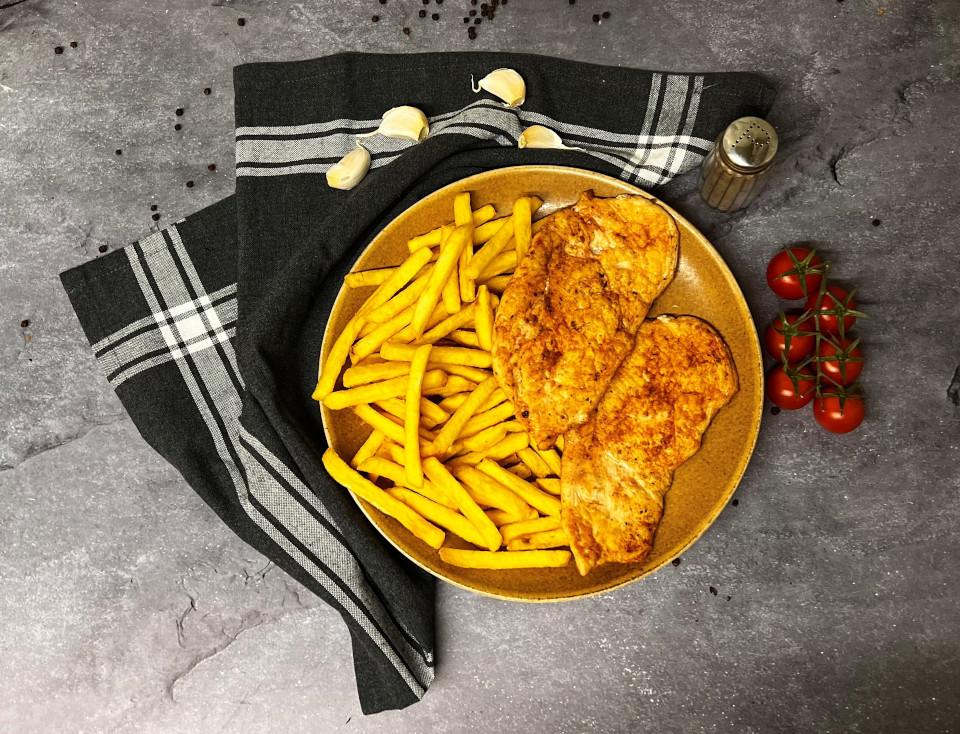 1 szelet rántott csirkemell, választható köret (hasábburgonya/rizs/friss zöldség tzatzikivel)