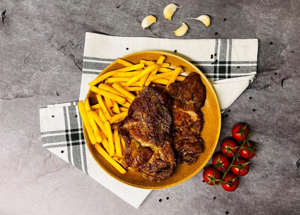 2 szelet rostonsült tarja, választható köret (hasábburgonya/rizs/friss zöldség tzatzikivel)