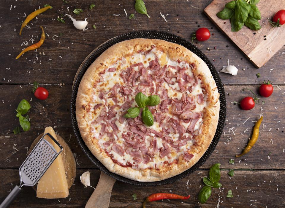 Töltött szél,tejfölös alap, csirkemell kocka, bacon, vöröshagyma, füstölt sajt, mozzarella
